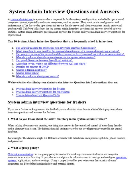 Read System Administrator Interview Questions And Answers Doc Doc online is a convenient and frugal way to read System Administrator Interview Questions And Answers Doc you love right from the comfort of your own home. Yes, there sites where you can get Doc "for free" but the ones listed below are clean from viruses and completely legal to use.